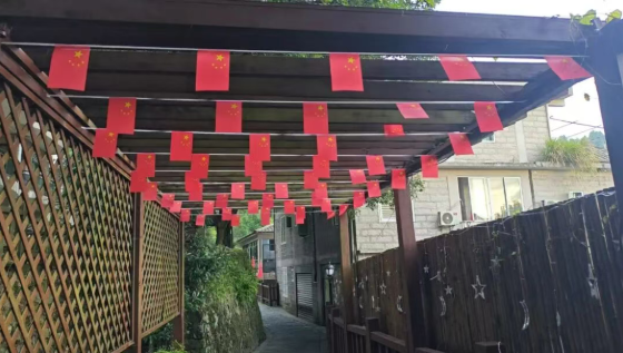 柳杉王公园两侧、游客中心周边、老街护栏挂满整齐红旗,长廊上方飘着小红旗装饰,走在百年老街,仿佛穿行在红色海洋;万国公益社的巨型爱心打卡点,是拍照打卡的 C 位,随手拍都能彰显爱国情怀!