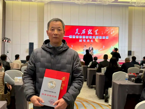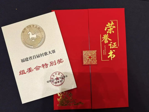 左一为歌曲《鼓岭召唤你》词曲作者 唐书农上台领奖